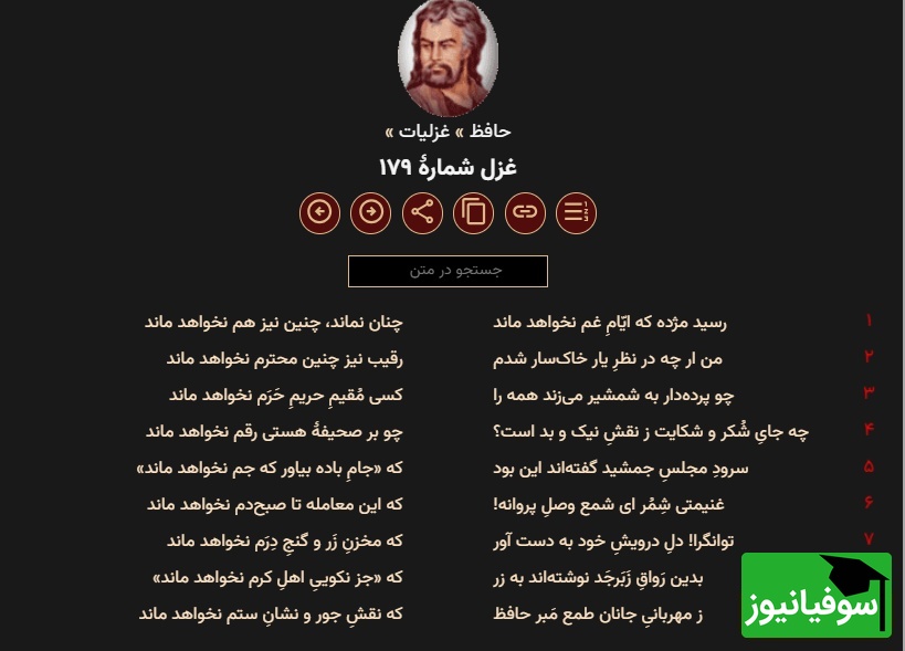 به گزارش سرویس چند رسانه سوفیانیوز، خواجه شمسالدین محمد شیرازی متخلص به «حافظ» و مشهور به لسانالغیب، غزلسرای بزرگ و از بزرگان شعر و ادب پارسی است. از زندگانی وی همانند دیگر بزرگان و سخنوران کهن ایرانی به رغم شهرت فوقالعادهٔ او اطلاعات دقیقی در دست نیست و حتی در مورد نام دقیق وی (محمد یا شمسالدین) و خاستگاه وی و سالهای عمر او اختلاف نظر وجود دارد. اما بنابر قول مشهور وی حدود سال 726 هجری قمری در شیراز متولد شد. علوم و فنون را در محفل درس استادان زمان فراگرفت و در علوم ادبی عصر پایهای رفیع یافت. خاصه در علوم فقهی و الهی تأمل بسیار کرد و قرآن را با چهارده روایت مختلف از بر داشت. گوته دانشمند بزرگ و شاعر و سخنور مشهور آلمانی دیوان شرقی خود را به نام او و با کسب الهام از افکار وی تدوین کرد. دیوان اشعار او شامل غزلیات، چند قصیده، چند مثنوی، قطعات و رباعیات است. وی به سال 792 هجری قمری در شیراز درگذشت. آرامگاه او در حافظیهٔ شیراز زیارتگاه صاحبنظران و عاشقان شعر و ادب پارسی است.