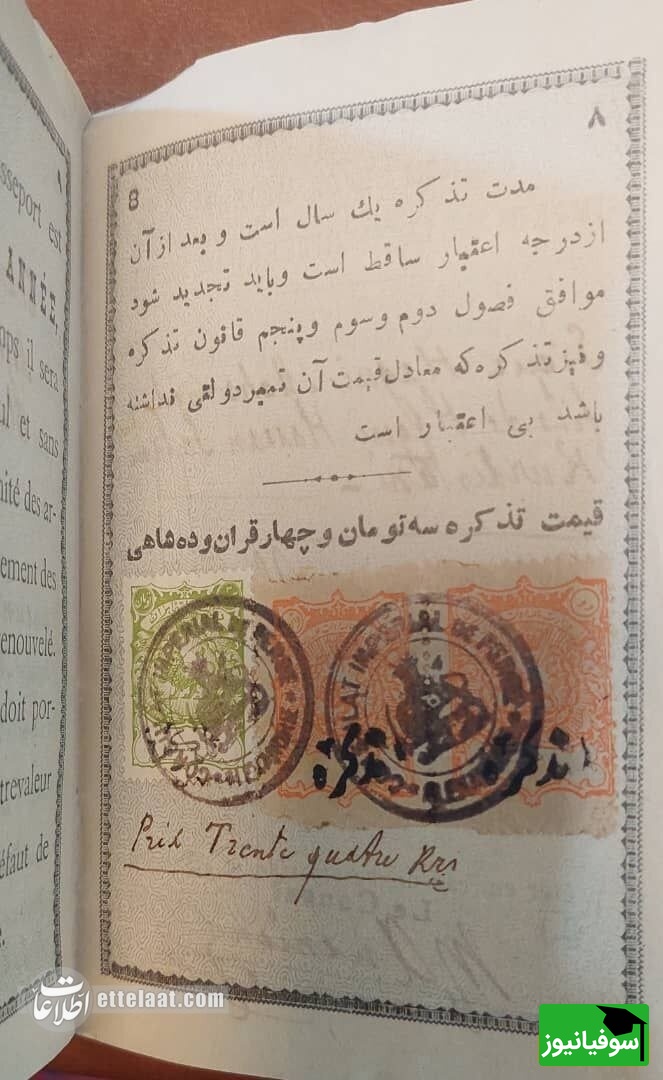 به گزارش سرویس تاریخ سوفیانیوز، از سال 1260 صدور گذرنامه برای شهروندان ایرانی آغاز شد. نمونهای که مشاهده میکنید در سال 1302 صادر شده. صفحات تذکره اقامت یک شهروند ایرانی در دوران احمد شاه قاجار را تماشا کنید.