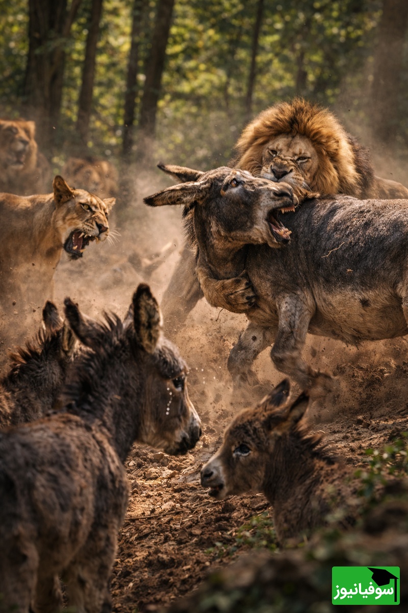 🔸 در برخی موارد نادر، لگدهای قوی الاغ ممکن است شیر را مصدوم کند، اما معمولاً شیر برنده این نبرد است.