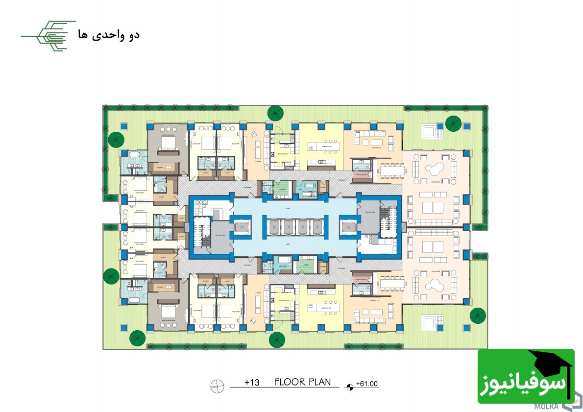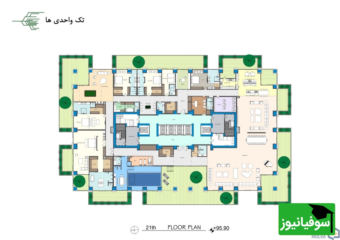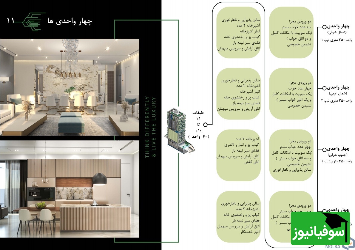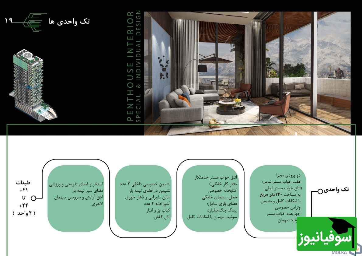 طبقات 11 الی 20 دو واحدی 800متری شمالی جنوبی استخر دار . 21الی 24 تکواحدی 1600متری دارای 500متر تراس و استخر