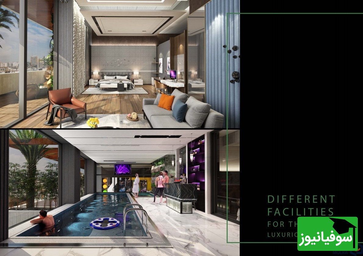 2 استخر آفتابگیر در طبقه ی 9 با تراس اختصاصی ب ارتفاع 10متر
