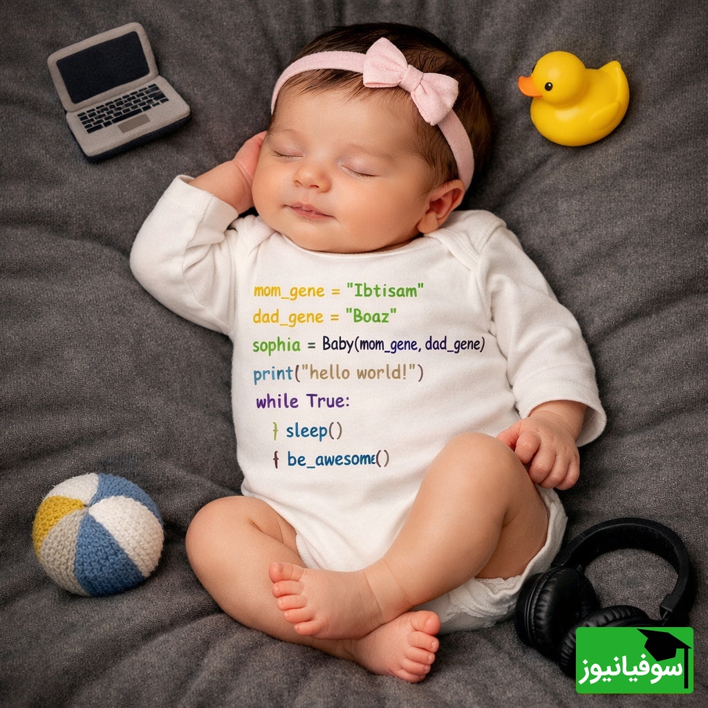 به گزارش سرویس چندرسانهای پایگاه خبری سوفیانیوز، تصویر جالبی که میبینیم، نوزاد خوابیدهای را نشان میدهد که لباسش (سرهمی) با ذوق و سلیقه خاصی طراحی شده است. روی این لباس، کدهای برنامهنویسی به زبان پایتون چاپ شده که به شکل نمادین، فرآیند به دنیا آمدن و زندگی این نوزاد را توضیح میدهد. در کدها آمده که نوزادی به نام «سوفیا» از ترکیب «ژنهای مادر و پدر» (با نامهای ایبتیسام و بوعز) ایجاد شده و با دستور print('hello world!') که اولین درس هر برنامهنویس است، ورودش به دنیا را اعلام کرده است. در ادامه هم یک حلقه تکرار برای خوابیدن و «عالی بودن» نوزاد تعریف شده که نشاندهنده خلاقیت والدین اوست.