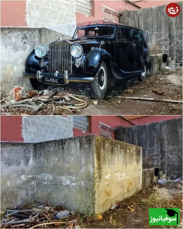 ماشین قدیمی: سعی نکنید در را باز کنید چون فقط به دیوار برخورد خواهید کرد. این ماشین براق سیاه در واقع فقط نقاشی روی یک سکوی بتنی صاف است.