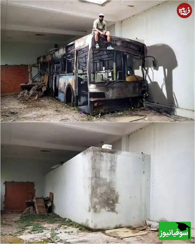 اتوبوس سوخته: این اتوبوس بدون شک دیر کرده است! انگار یک حجم فلزی سنگین در اتاق قرار دارد، اما در واقع فقط یک نقاشی هوشمندانه است. اودیت از گوشه اتاق برای ایجاد شکل سهبعدی استفاده کرده است.