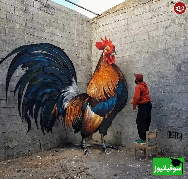 خروس غولپیکر: این خروس قطعاً رئیس این گوشه متروکه است. رنگها بهقدری روشن هستند که در مقابل بتن خاکستری واقعاً برجسته میشوند. انگار آماده است یک قوقولیقوقوی صبحگاهی بلند سر دهد. تقریباً میتوانید پرهایش را حس کنید.