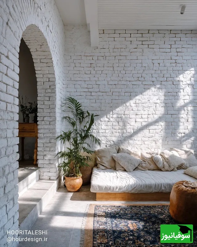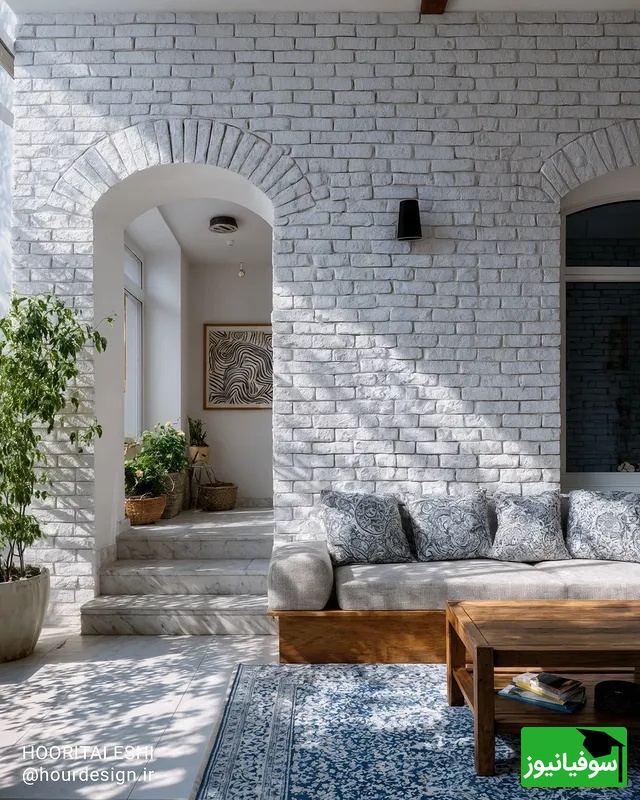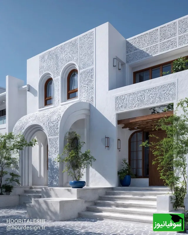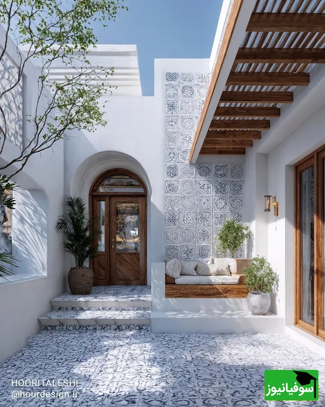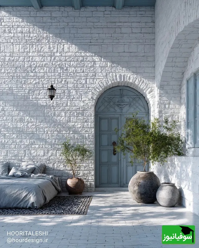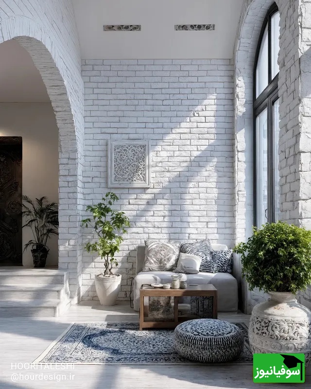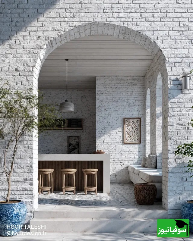 به گزارش سرویس دکوراسیون سوفیانیوز، سرای سپید، ترکیبی از حجمهای ساده و سفید، قوسهای منظم و نقوش هندسی آبی رنگ. رنگ سفید به عنوان رنگ زمینه، موجب خوانایی فرم و برجستهسازی الگوی تزئینی آبی شده که با اقلیم گرم و خشک سازگار است. قوسها و بازشوهای متناسب، نور طبیعی، سایههای کنترل شده و تهویهی باز در این طراحی اهمیت ویژهای دارند و آجر به عنوان مصالح سنتی، با بیانی امروزی بکار رفته تا اثری خلق شود که همزمان اقلیمی، فرهنگی، ساده و معاصر باشد.