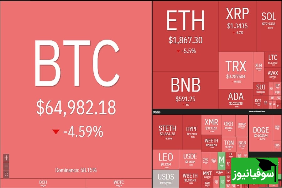 بر اساس آخرین داده های بازار، بیت کوین (BTC) با کاهش 4.05 درصدی به قیمت 64,939 دلار سقوط کرد. اتریوم (ETH) نیز با افت 4.80 درصدی به محدوده 1,863 دلار رسید و سولانا (SOL) با ثبت بیشترین کاهش در میان ارزهای اصلی، 6.19 درصد از ارزش خود را از دست داد و به 77.75 دلار رسید.