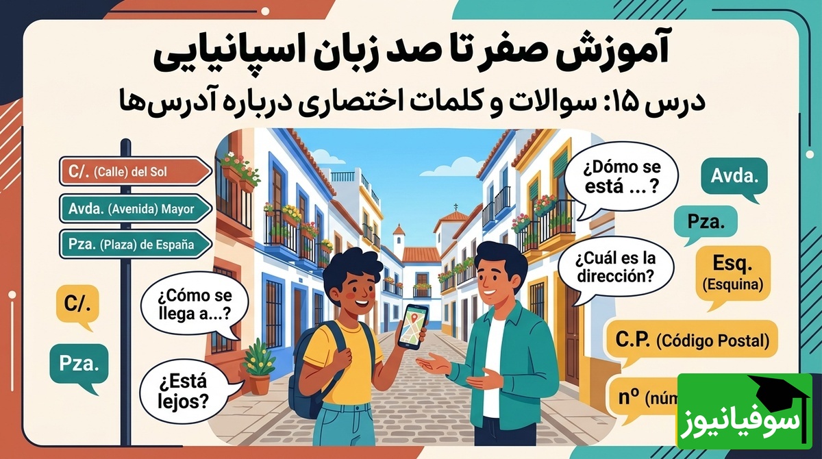 سوفیانیوز: در درس پانزدهم آموزش زبان اسپانیایی، با نحوه پرسیدن آدرس، جملات کاربردی در سفر و لیست کامل کلمات اختصاری پستی (مانند C/ برای خیابان و Avda برای بلوار) آشنا شوید تا به راحتی مسیر خود را در شهرهای اسپانیاییزبان پیدا کنید.